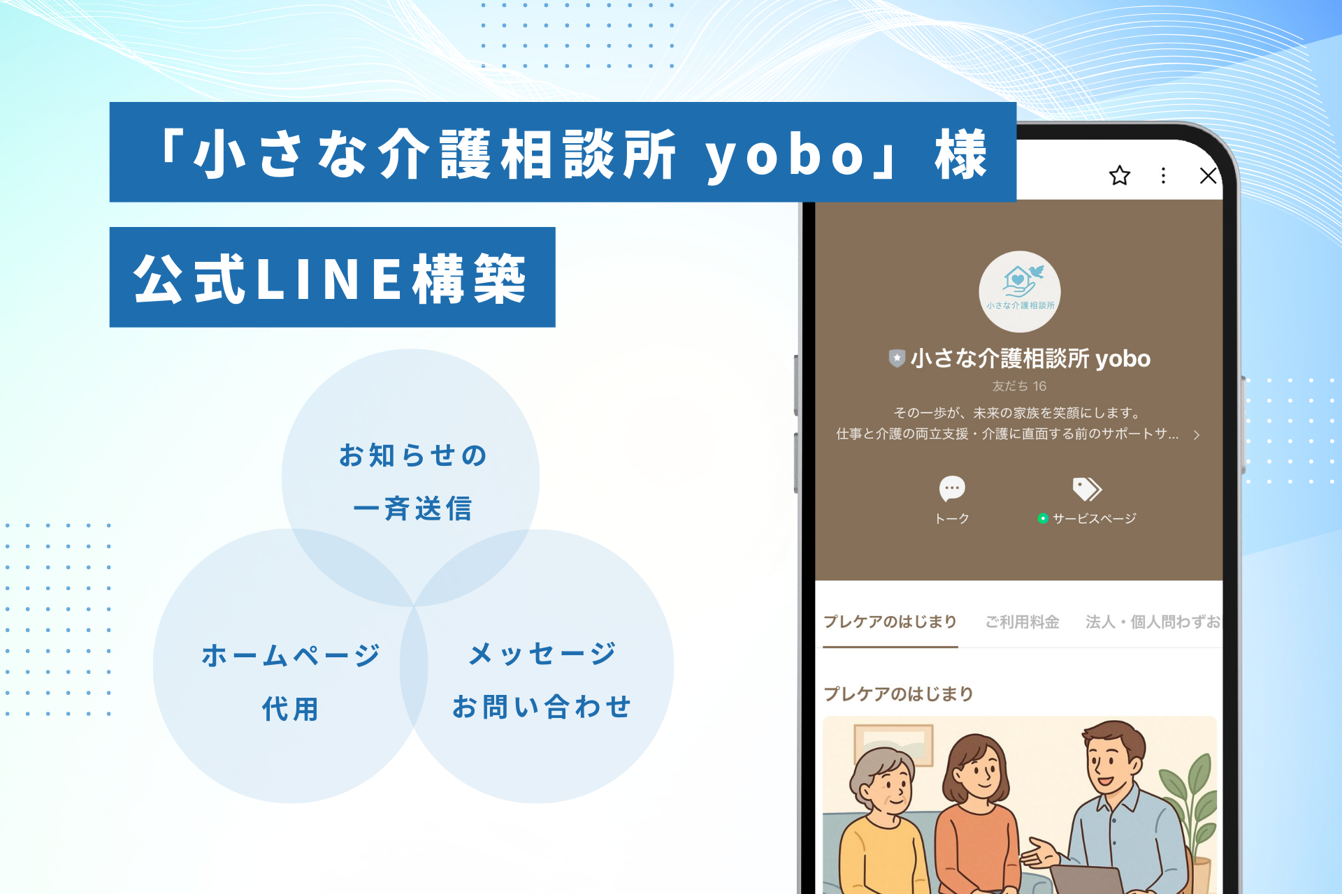 Support Stakesではこのたび、仕事と介護の両立支援を行う「小さな介護相談所 yobo」様の公式LINEを構築いたしました。